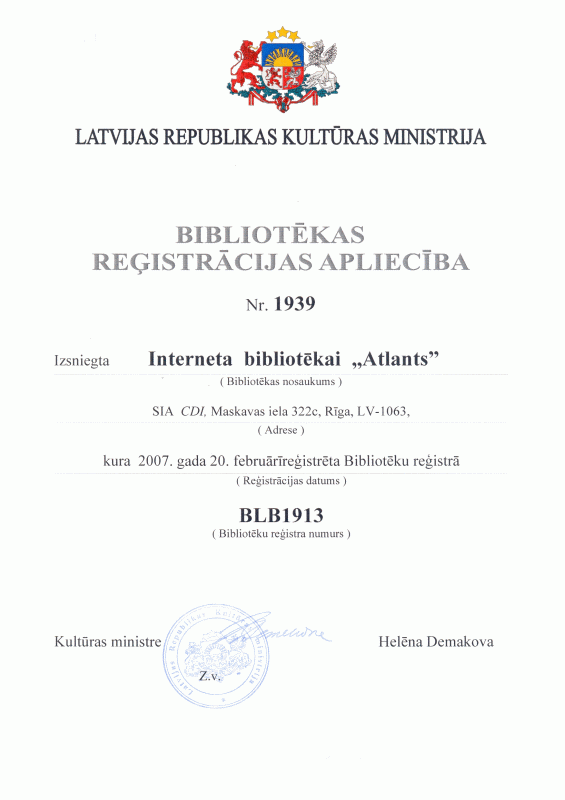Bibliotēkas reģistrācijas apliecības numurs: 1939