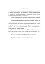 Studiju procesā uzsvērts, ka personību intervijās ir svarīgi uzdot atvērtus jautājumus, bet nav zināms, cik daudz šādu jautājumi tiek uzdots intervijās. Tādēļ pētījumā noskaidrots komentāru, atvērtu un slēgtu jautājumu īpatsvars intervijās ar māksliniecēm. Žurnālistu priekšstati pētījumā atklāti analizējot uzdoto jautājumu tēmas. Ņemot vērā mūsdienās vadošo uzskatu mainību, intervijas analizētas divu gadu posmā – 2005. un 2006. gadā.